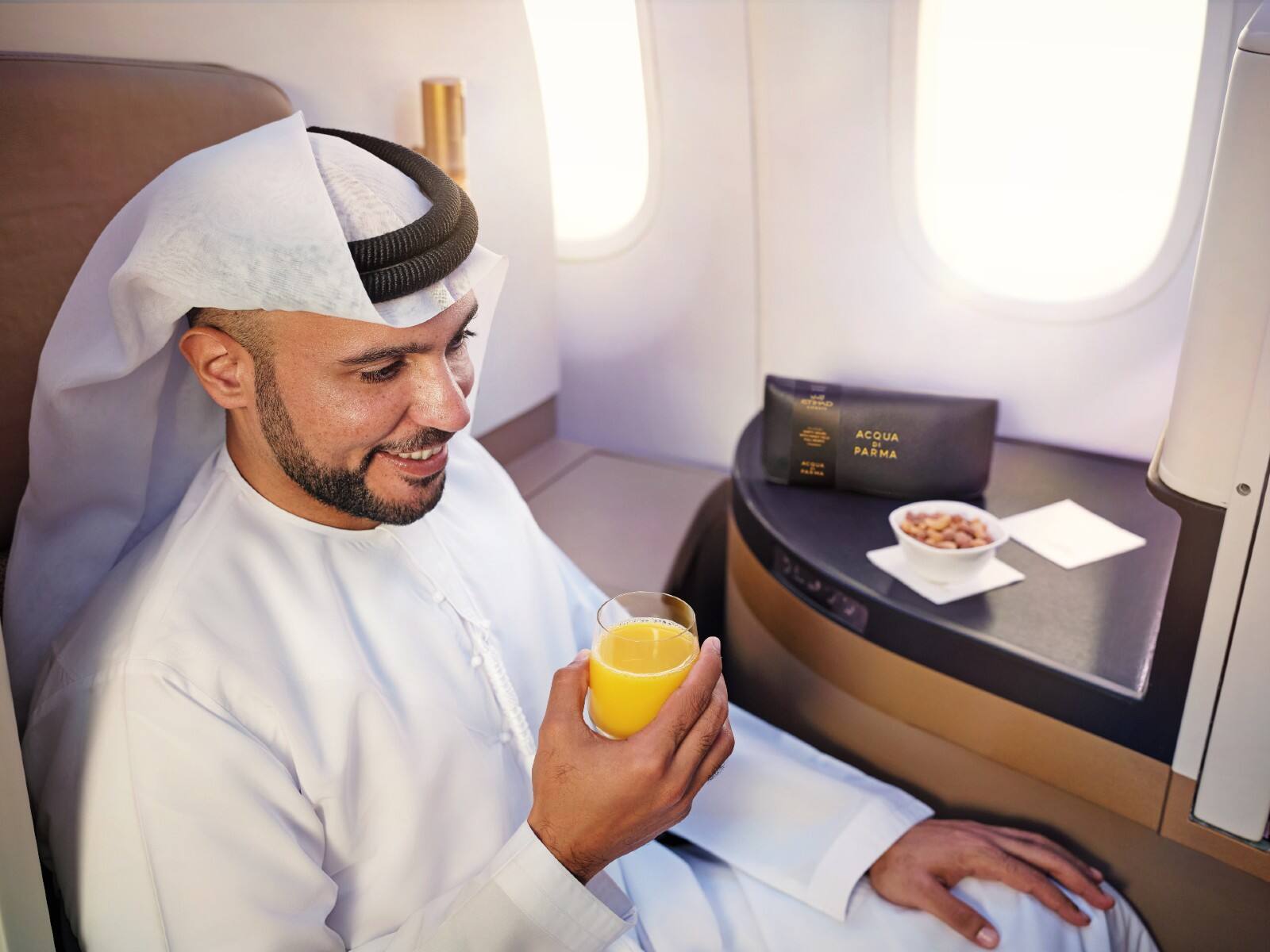 guests enjoying business class meal in etihad